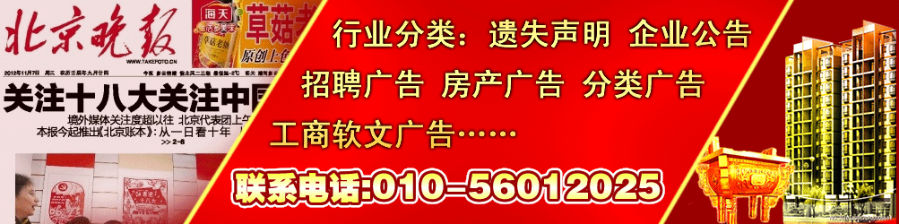 北京晚報社廣告分類:遺失聲明廣告,注銷公告廣告,減資公告廣告,拍賣公告廣告,房屋出租出售廣告,人才招聘廣告,招生留學廣告,旅游廣告,醫療健康廣告,工商軟文廣告等等廣告業務,歡迎來電洽詢:010-56012025/26  更多